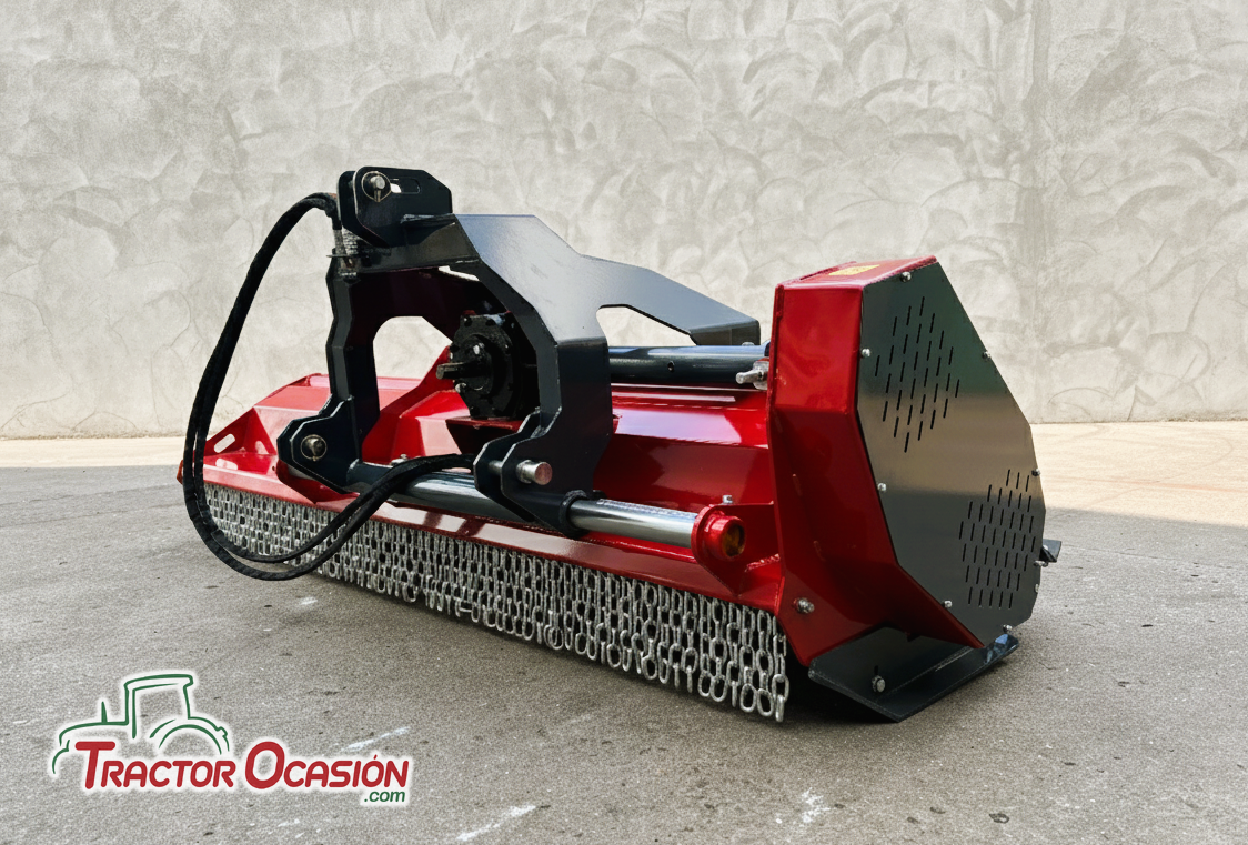 Enganche CAT 2 con desplazamiento de 500 mm, doble chasis, grupo en fundición con rueda libre, transmisión 5 correas con tensor, rotor helicoidal con martillos forjados, Patines y rodillo con ajuste de altura, portón trasero abatible, contra martillos intercambiables, cardan T60.
