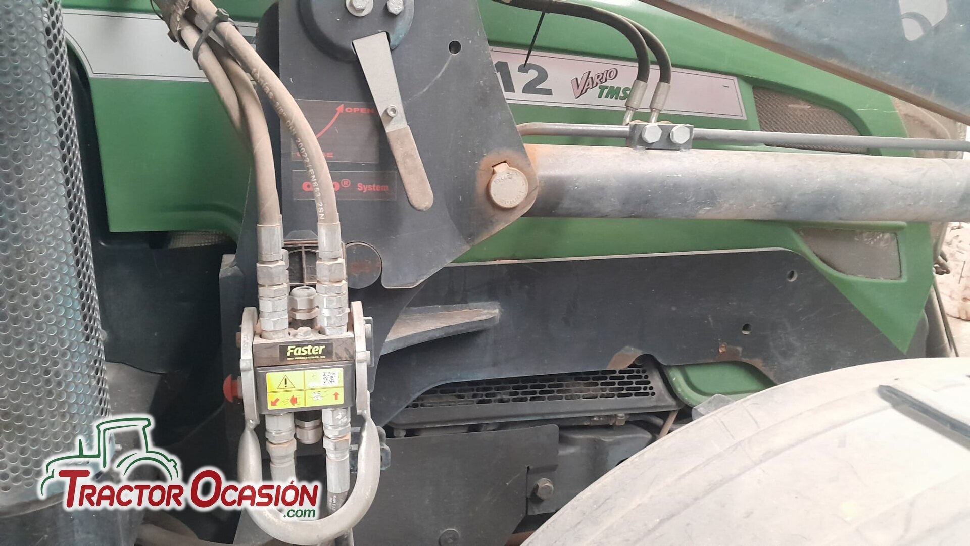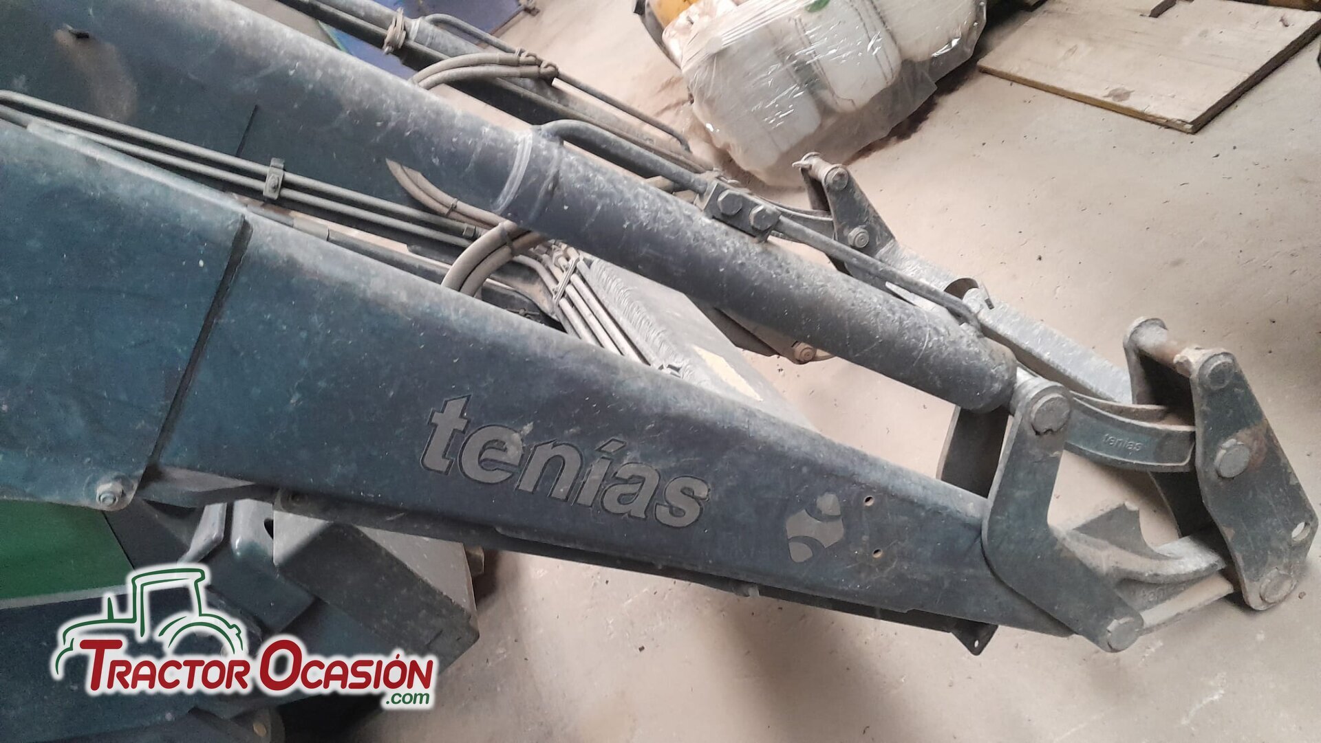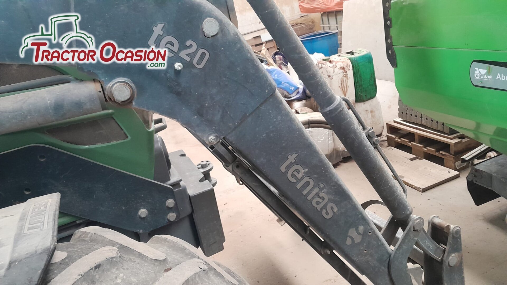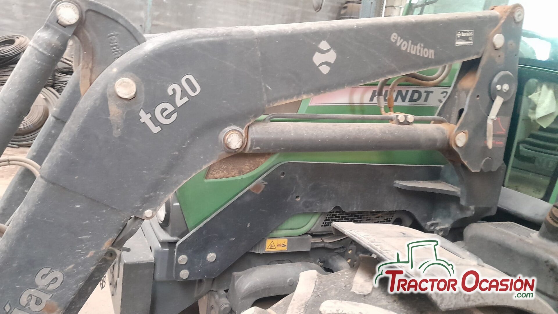 Pala Tenias TE 20 en perfecto estado y con bombines reforzados, amortiguación, enganche hidráulico faster y enganche rápido cazo, 6000€, montada sobre un Fendt 312